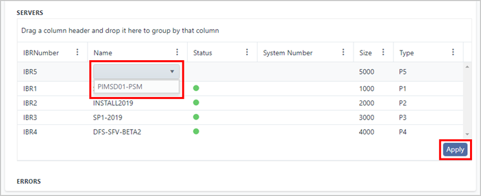 In the Servers area of the License page, you can assign a Sigmafine Server for each available IBR number. , you can assign a Sigmafine Server by selecting it from the drop-down list.