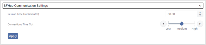 (Optional) Connections Time Out: Move the slider left or right to decrease or increase the length of the time out in minutes. You can also use the left and right circled arrows to move between Low, Medium and High. It is good practice to select Low, Medium or High according to the network bandwidth and Latency between the browser and the SFHub Application Server. Typically this parameter needs to be increased whenever users experience issues establishing the connection to the SFHub Application Server from the browser.