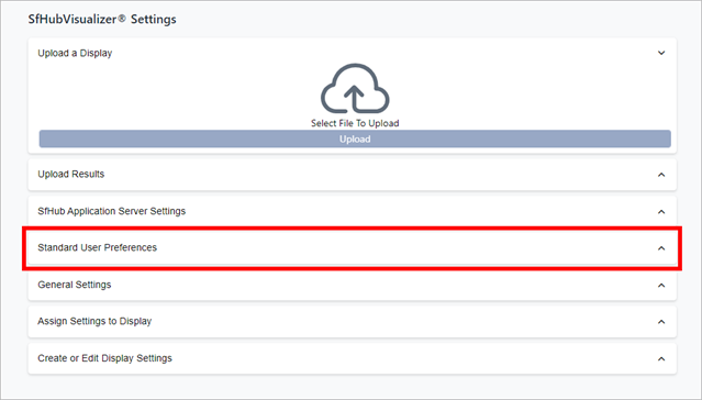On the SFHub Visualizer Settings page, in the Standard User Preferences panel, you can define a set of default user preference settings that are then automatically applied to every new user (when a new user is added).