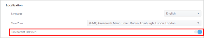 The Time format (browser) setting allows you to set the time format (standard time or military time) according to the format of your browser in which the application is running. By default, this option is enabled; meaning the time format will mimic that of the browser. If you would prefer that the browser not be used for the time format, you can disable this feature.
