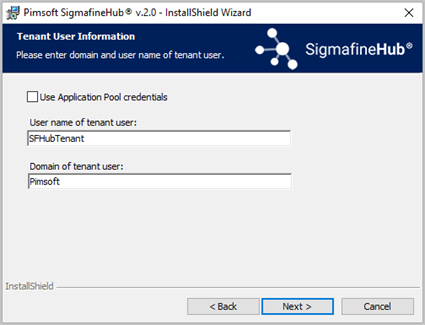 This page allows you to define which Domain User is to be the "Tenant" user. The Tenant user is the first user of the SigmafineHub application. This user has all the privileges needed to initially configure the application itself (add user and define their access rights).