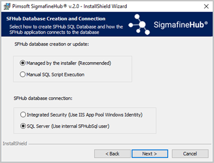 Managed by the installer (Recommended): Connect to the SQL Server instance to create and configure the SFHub database.