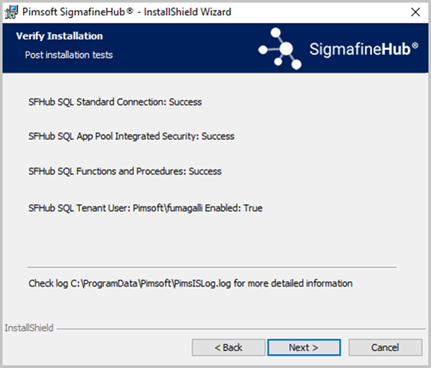 The remaining row shows where the SFHub installation log is stored. If one of these tests display an unexpected result, please see the log files and contact