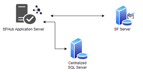 In such a scenario, SigmafineHub is installed on a different computer than the SF Server and the SFHub SQL Server database (as indicated in the following figure).