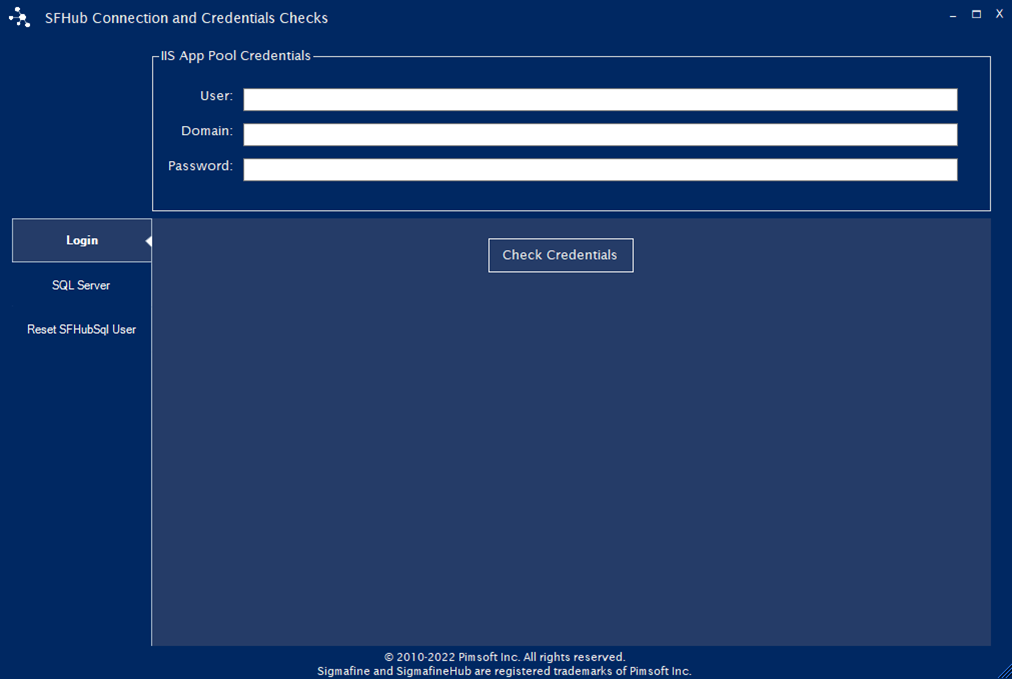 The Check Credentials and Connection option in the main window allows you to check IIS App Pool login credentials check the SQL Server connection and reset the SFSHub Sql User credentials and information.