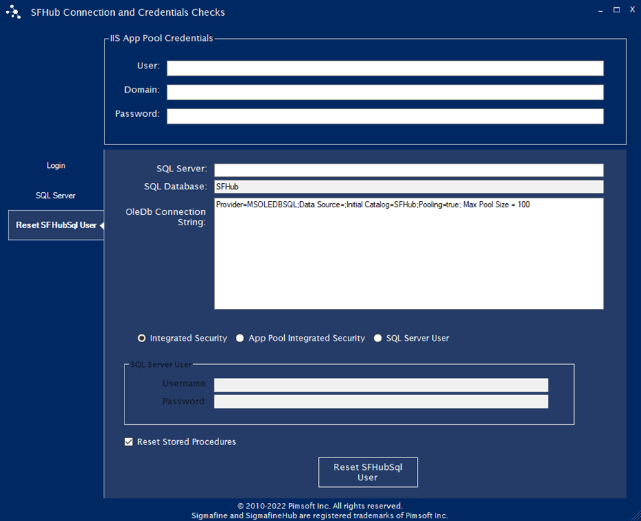 Click the Reset SFHubSql User button to connect to the database, reset the SFHubSql user to its initial configuration and if selected, reset all the SFHub stored procedures and functions.