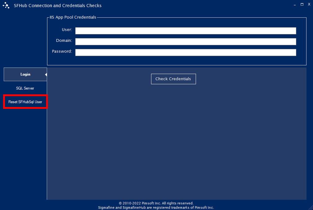 SFHub Connection and Credentials Checks - select Reset SFHubSql User tab