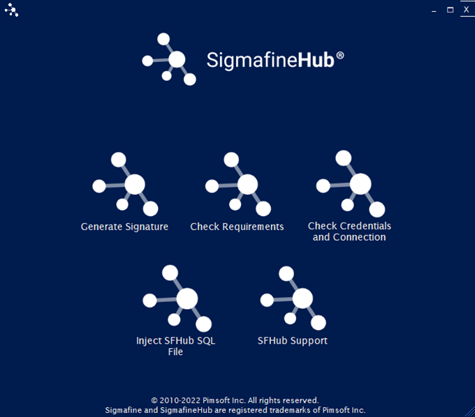 Inject SFHub SQL File -- Opens a new window allowing the user to inject Pimsoft signed SQL files into SFHub database. (See Inject SFHub SQL File)