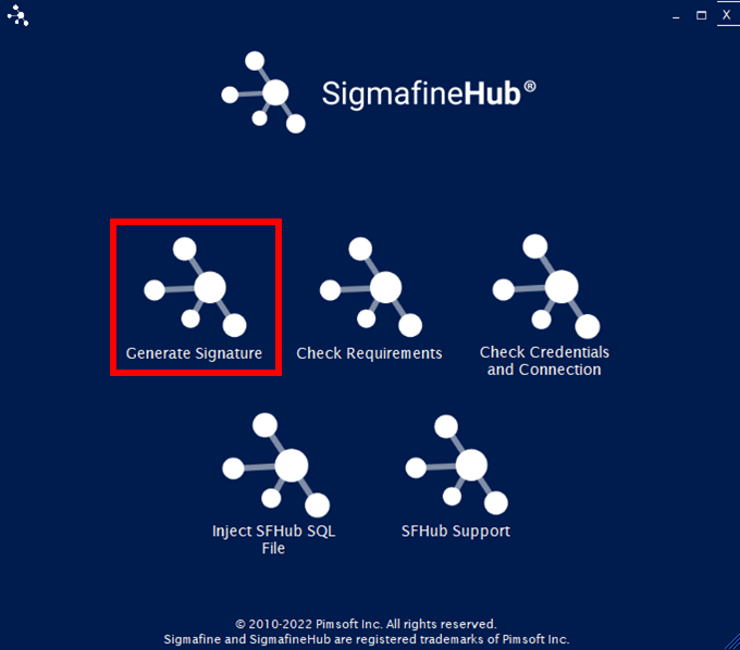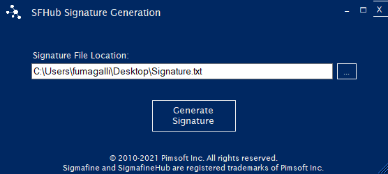 The SFHub Signature Generation window allows you to the machine signature file required by SigmafineHub.