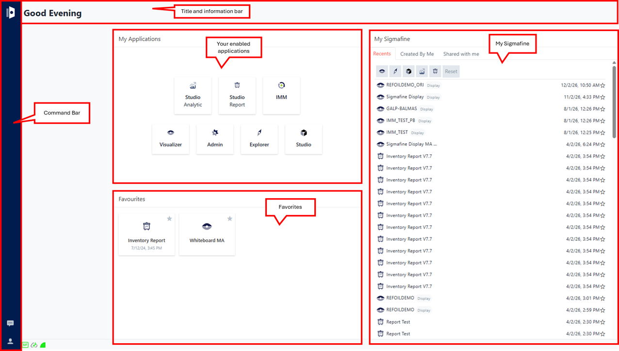 Your dashboard is divided into the five areas; Title & Information, My Applications, Favorites, My Sigmafine and the command bar. The following table explains each of the areas of your dashboard.