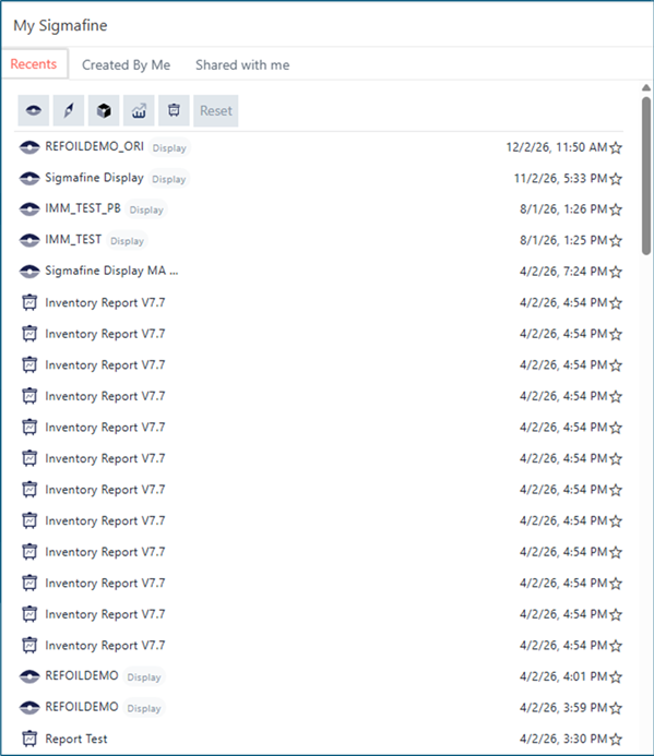 The My Sigmafine area of your dashboard provides you with listings of all accessible entities you have access to. The entity tabbed panels (Recents, Created by Me, and Shared with me) each include an additional set of Filtering toggles that allow you to further narrow the scope of the list on each panel by application.