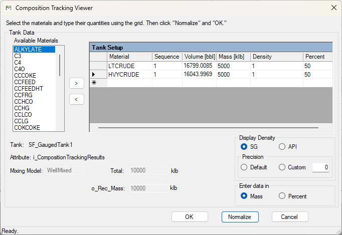 This dialog shows the total mass or volume in the tank, the configured mixing model and an empty table to enter the components and their respective mass or volume and percent mass or percent volume. Using the above dialog, you can enter the initial composition of the inventory tanks.