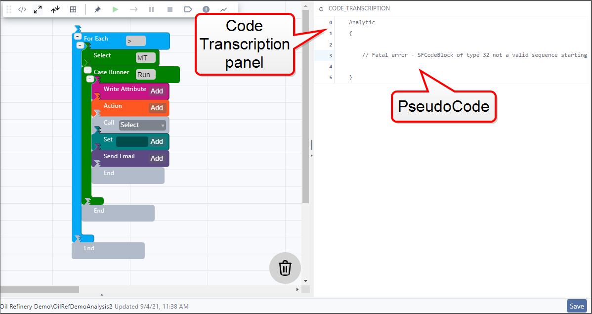 Open PseudoCode icon allows you to open the Code Transcription panel that displays the analytic's pseudoCode. The icon works like a toggle, meaning that you can use the same icon to both open and close the panel.