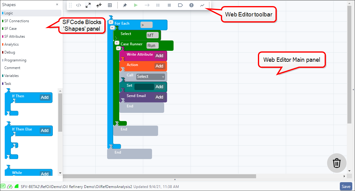 SFHub Studio comes with a Web-based visual code editor that uses interlocked graphical SFCode Blocks to represent the analysis logic. The SFHub Studio visual code editor is intended for developing analysis on the Sigmafine server only, therefore even though it comes with standard programming concepts like variables, loops, logical expressions, function calls, etc., the SFCode Block programming set is specifically designed for, and limited to, the scope of SFHub Studio. The SFCodeBlock set is neither designed for, nor intended for use in developing applications. In addition to the code blocks, the SFHub Studio Web visual code editor comes with a debug environment, that allows you to test and evaluate the performance of SFHub Studio Analytics.