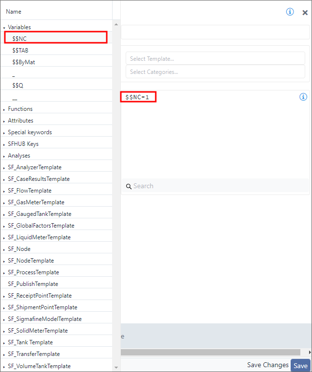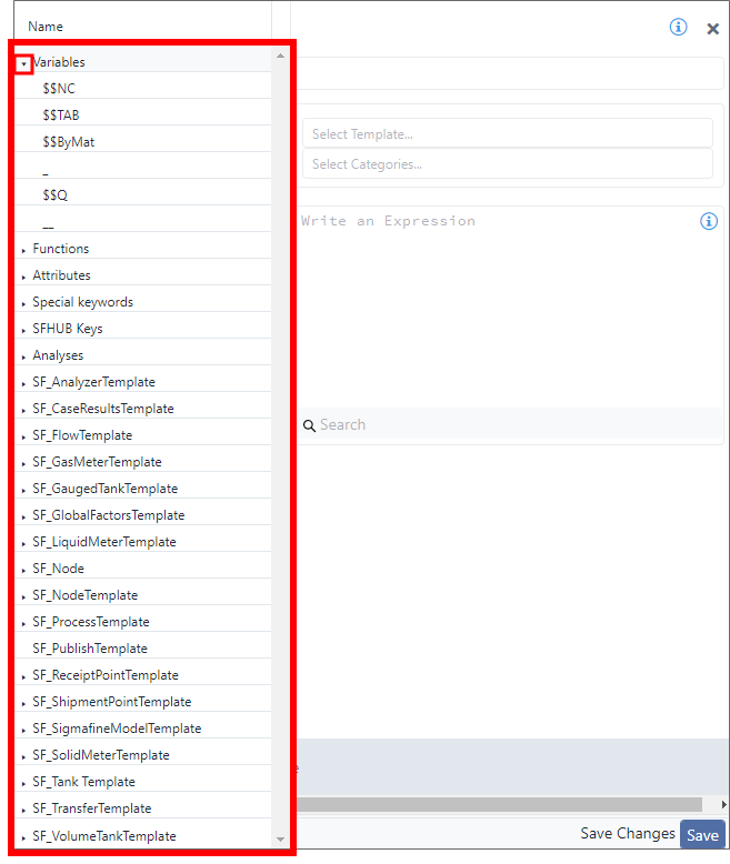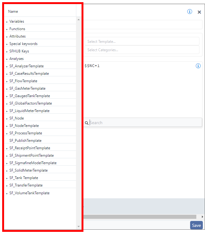 A panel opens on the left side of the Property panel containing categories with associated keywords that are specific to the project, analytic and SFCode Block you are working with.
