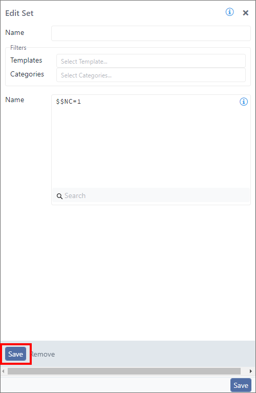 - TemplatesProperty panel Search bar Save The Save button saves whatever parameter values you have selected or entered for the code block. Remove The Remove button deletes the code block from the selected SFCode Block. x The Close icon closes the property panel. (Optional) Click on an Information icon to learn more about a specific value.