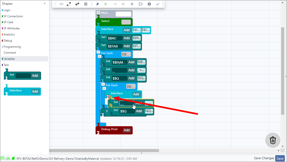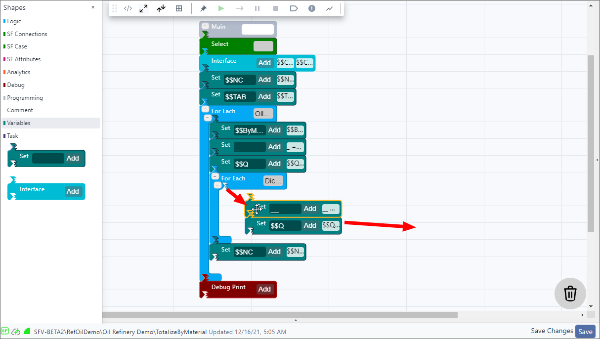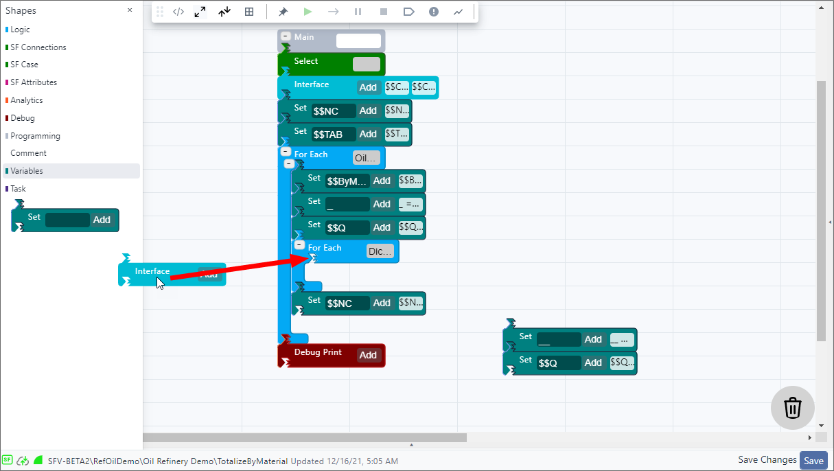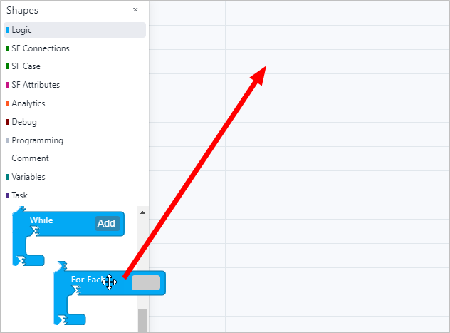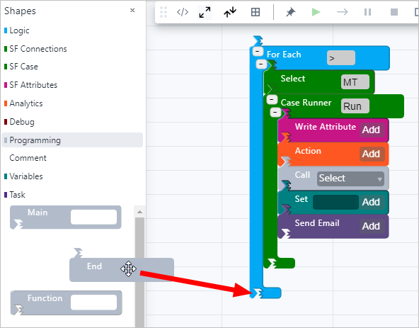 SFCode Blocks can be used to start and end an analytic as well as perform all other processes within the analytic. The Shapes panel provides all available SFCode Blocks based on their type of function. For example, the Programming code blocks are usually used to start and end an analytic function and call other functions, whereas the Logic code blocks are used to create what happens when each analytic function runs.