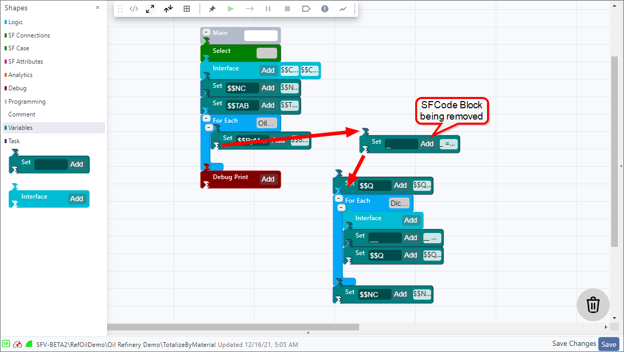 When you remove a SFCode Block, all code blocks connected to that code block are removed as well. This helps to prevent extraneous code blocks from causing the analytic to fail during an execution.
