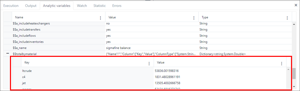 The Analytic variables panel contains the list of all the analytic variables, Sigmafine analysis configuration parameters and user defined variables, along with their values and data types. The panel shows values in real-time when the debug stops at a break point. If the variable is a complex data type, like 'Dictionary', you can expand the variable content to view each individual value by clicking on the plus button at the left of the variable name.