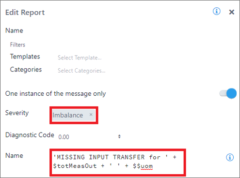 In the following example, a Report code block has been configured to generate the diagnostic information "missing transfer". The information is also associated with a specific severity code, in our example Imbalance.