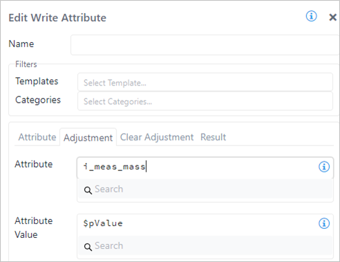 In the following example, a Report code block has been configured to generate a diagnostic message, and an inner Write Attribute code block creates an adjustment on the i_ Meas_Mass attribute using a value stored in the variable \$pValue getting the value from the previous case.