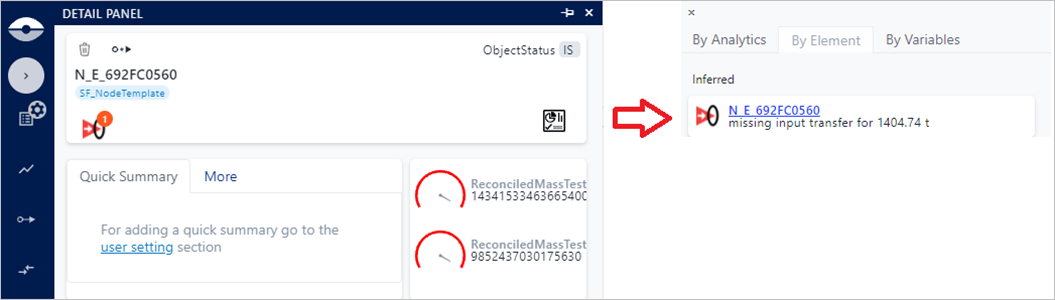 The presence of digital information associated to elements is visible in the element tool-tip and detail panel, where severity icons are shown.