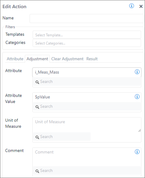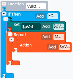 In the following example, a Report code block has been configured to generate a diagnostic message, and an inner Action code block suggests the creation of an adjustment on the i_Meas_Mass attribute using a value stored in the variable \$pValue.