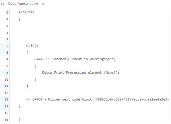 The analytic consists of a single Debug.Print SFCodeBlock. As it is executed in parallel for all the elements of the input working space, the result will be the list of all the element names (as shown in the following example image).