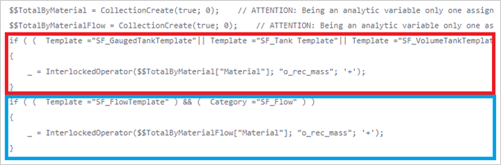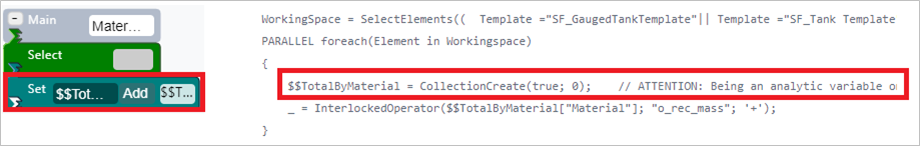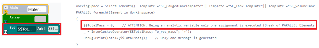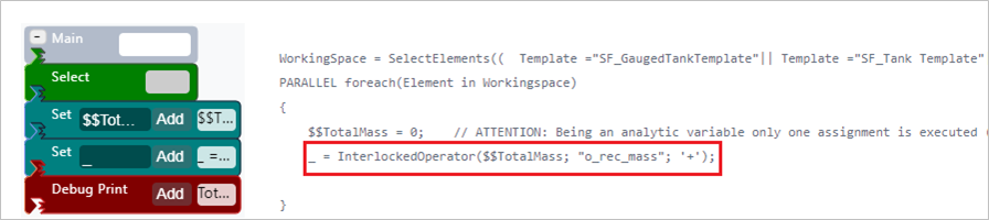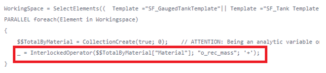 Similar to the Totalization example, the InterlockedOperator function is used to perform safe totalization over the analytic variable of type SFHub Dictionary storing the totals by material.