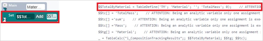 The Totalize by Key analytic is now organized in a different way, in order to totalize the tank mass by material as well as to totalize the flow mass by material. In this example the 'Select' SFCodeBlock has been removed and we will use the pattern feature applied to the 'Set' code block to perform two different totalizations.