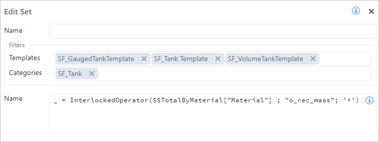This is the Set code block where the pattern is configured for the SF_Tank element category. The totalization is then performed over the dedicated analytic dictionary variable '$$TotalByMaterial'.