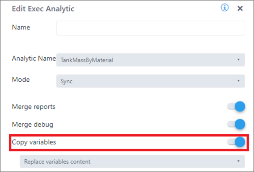 At the end of its execution, the two analytic variables populated by the called analytics are available on the caller analytic, based on the configuration of the \'Exec Analytic\' SFCodeBlock.