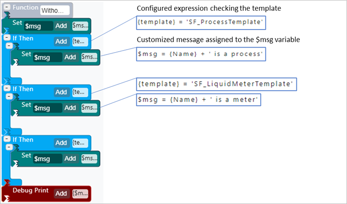 Without the support of the pattern, the only available approach would be to create a sequence of 'If Then' SFCodeBlocks (one for each element template) and customize the message in each one, as shown in Figure 6.