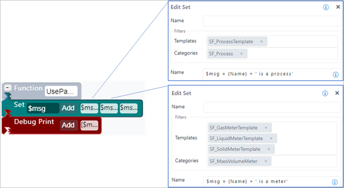 The majority of SFCodeBlocks support multiple patterns. Patterns are powerful features that allow the definition of different actions based on element template or category, helping a lot in creating complex analyses with a fairly minimum set of SFCodeBlocks.