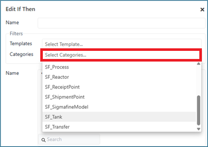 | Categories | Optional | This is a drop-down list that allows you to select the element categories. Element Categories drop-down list example The listed Element Categories are those that are configured in the Sigmafine database to which the SFHub project is linked. If no element categories are selected, it is assumed that all the AF Elements in the working space are involved in the configured pattern. |