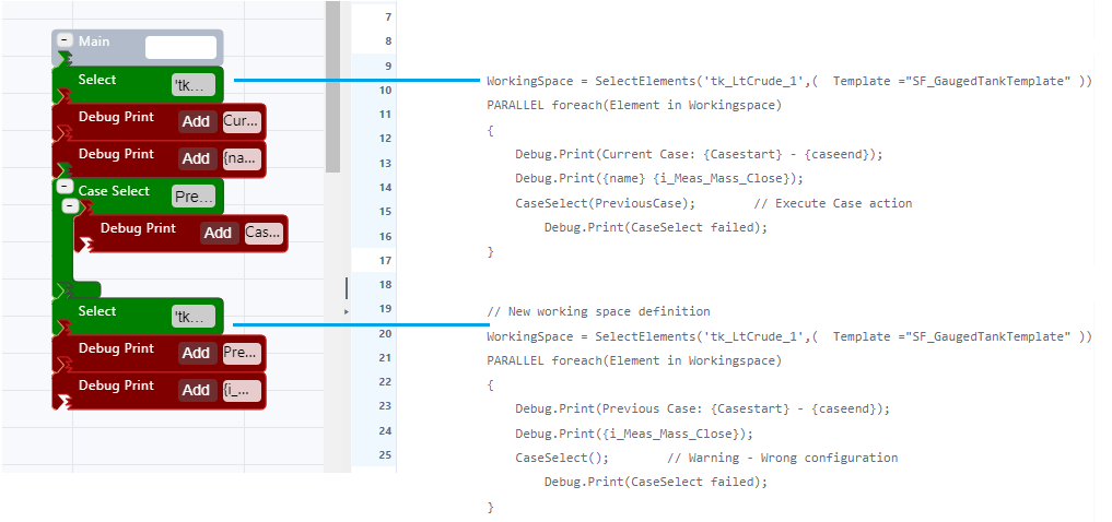 | Description | Case Select allows you to change the execution context of the analytic, by switching over to a different case. 1. If the new case is selected, the Working Space is updated with elements referring to the selected case. 2. If, for whatever reason, the case selection fails, misses a case or errors, the analytic executes the code block connected to the inner port (error handling). An analytic may contain multiple Case Select code blocks. If the new case is selected, the Working Space is updated in the following manner: 1. All analytic variables are preserved 2. Element variables referred to element existing in both the current and the new case are preserved 3. Element existing in the new case only, are loaded in the working space 4. Element existing in the current case only, are discarded 5. Transfers of the current case are not preserved, this including all related variables 6. Transfers of the new case are loaded in the working space. |