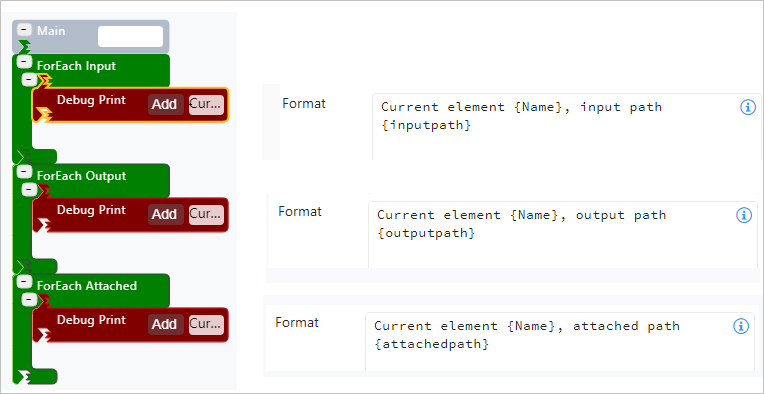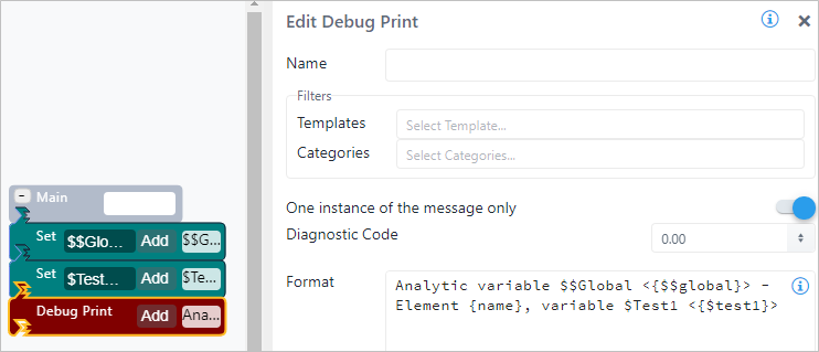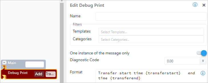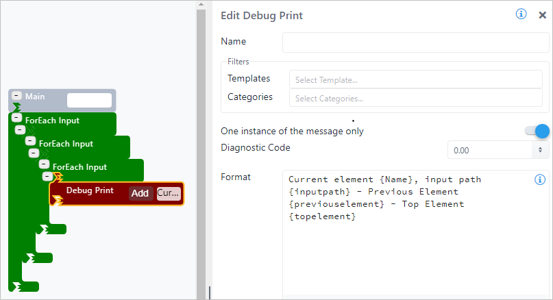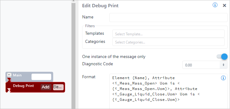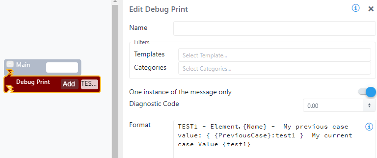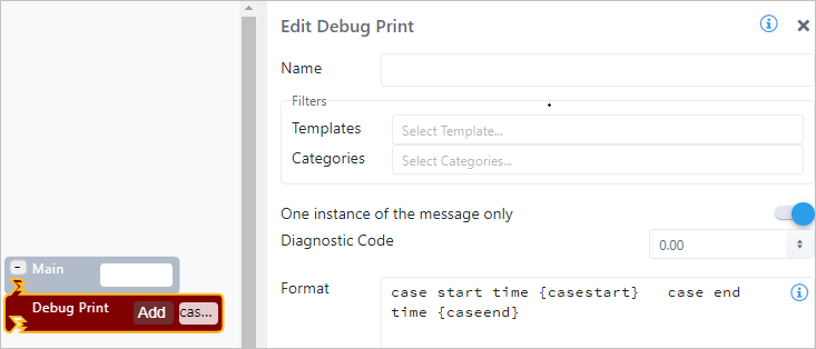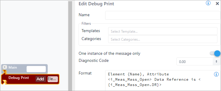 | Configuration | You are required to enter at least a format message. You can add as many prints as are required. To add a Debug Print pattern: 1. Click the Add button. Debug Print SFCodeBlock 2. Enter your configuration values in the Add DebugPrint configuration panel. 3. Repeat steps 1 & 2 for each required print pattern. Edit a Debug Print To edit a Debug Print pattern: 1. Click on the expression placeholder located in the shape. Action SFCodeBlock - Edit 2. Make the necessary changes in the Edit DebugPrint configuration panel. |