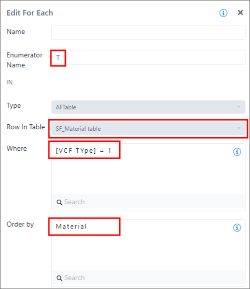 | Type | X | The Type drop-down allows you to select the type of collection to be enumerated. The following types of collections are supported: 1. Children Elements - Enumerate the children elements of the current element. 2. Previous Element - Enumerate the parent element of the current element 3. AF Table - Enumerate the rows of an AF Table 4. Attributes - Enumerate the items of a complex attribute type (Data Table or Array) contained in an attribute of the current element 5. SFHub Tables - Enumerate the rows of a SFHub table 6. Cases - Enumerate the Sigmafine Cases 7. Transfers - Enumerate the transfers stored in the Sigmafine database 8. Variable - Enumerate items stored in variables of complex data types (List, Table, Row or Dictionary). The configuration panel will dynamically show the required parameters for the selected type of collection to be enumerated. |