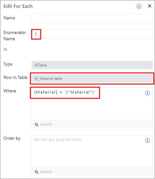 | Enumerator Name | X | Name assigned to the table rows enumerator. See the SFHub Enumerator topic "SFHub Enumerator" section of the "SigmafineHub Expressions Guide", for more information. The Enumerator Name represents the row entity containing the column values. If of type Table, or array items, or if of type Array, and can be used inside the loop to access the content. The row column or the array position can be addressed by the column name or by the column index. The first column has index = 0. |