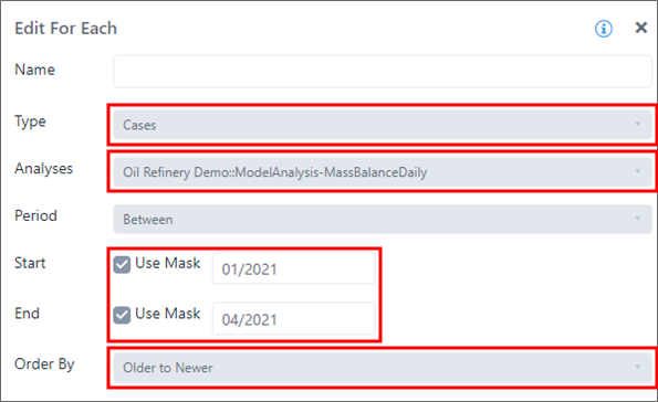 In this example, the 'For Each' loop is configured to enumerate all the Sigmafine Cases of the model analysis 'ModelAnalysis-MassBalanceDaily' included in the period starting from 'Jan 2021' until 'April 2021'. The case list is returned sorted by older to newer.