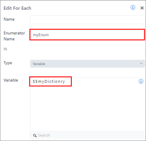 The For Each - Variable option allows you to enumerate items stored in variables of complex data types (List, Table, Table Row and Dictionary).