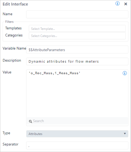 In this example, the Interface variable is named $$AttributesParameters and its default value is initialized by a string containing a list of attribute names, comma separated. The Type parameter is set equal to 'Attributes', to qualify an interface variable intended to be used as an attribute list.