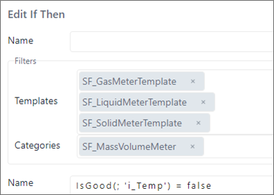 The 'If Then' is configured to check if the i_Temp attribute of the Mass Volume Meters contains a BAD VALUE.