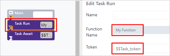 The Task Run configuration panel allows you enter the function to be executed and the variable that is to contain the task token.