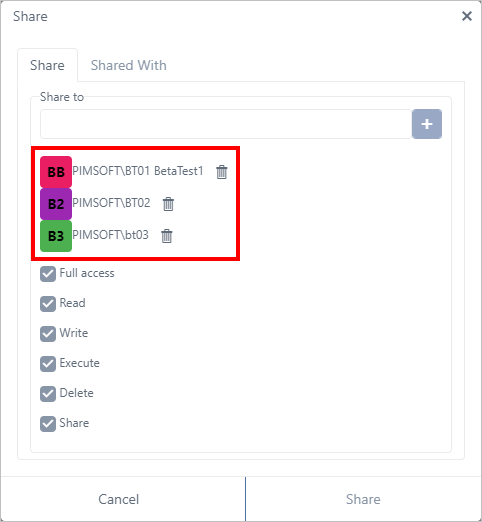 To assign permissions to multiple people on the Shared With tab: