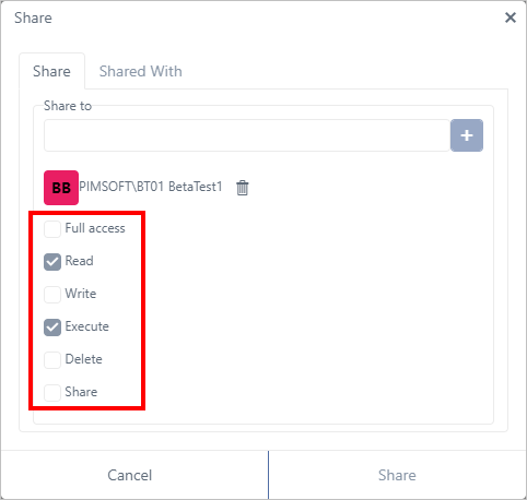NoteTo assign Full Access to a person, [do not]check the Full Access checkbox; instead, check the checkbox under each permission (Read, Write, Delete, Execute and Share).