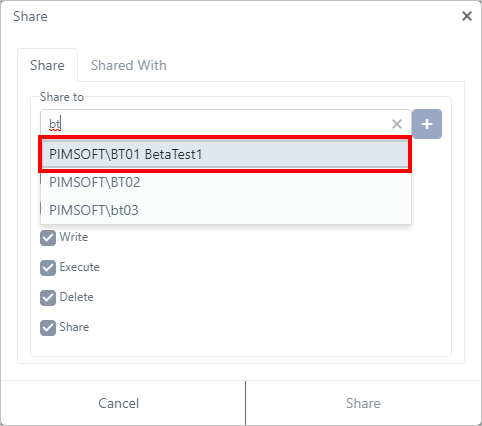 In the Share to box, begin typing the name of a user you want to share with.