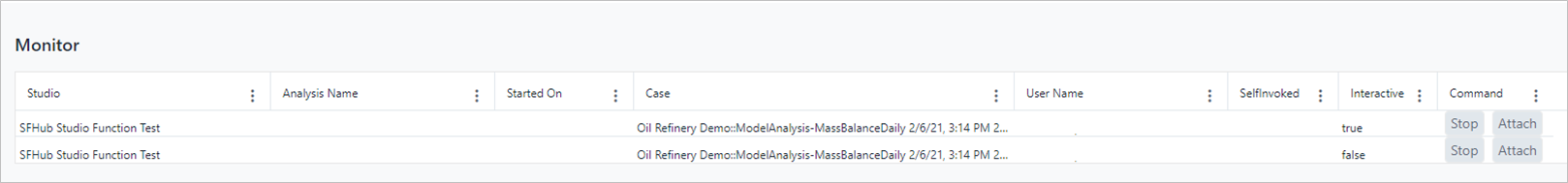 Column Description Studio Name of the Studio Project. Analysis Name Name of the analytic currently in execution. Started On Date and time when the analytic was activated. Case Sigmafine Case context under which the analytic is running (Model and Case time range are shown). User Name SFHub user that activated the analytic. SelfInvoked Interactive When True, it indicates that the analytic has been manually activated from the Analytic Web Editor for debugging purposes.