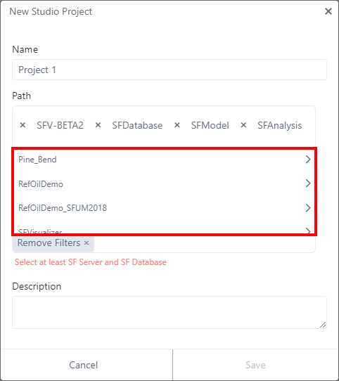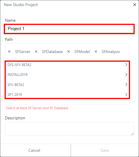 StudioNew Studio Project panel - select SFServer