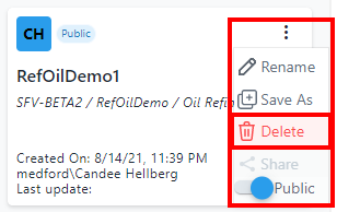 When you no longer need a project or you have created it in error and want to remove it, you are able to do so using the Delete feature. When you delete a project, it removes all of the project's content (Analytics, Dashboards and Workflows). If a project happens to contain entities that are referred to by other projects or SFHub entities, the application does not allow you to delete the project. Should you need to delete such a project, you must first remove the entities referred by the other Projects or SFHub entities.